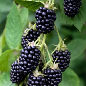 Mognadstid: Björnbär ’Navaho’ ger riklig skörd med svarta, stora, mycket smakrika bär som mognar i slutet av augusti och fortsätter att producera bär långt in hösten.