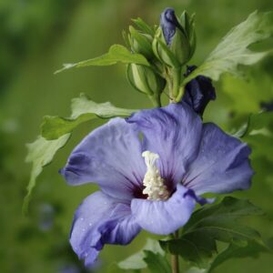 Frilandshibiskus ’Oiseau Bleu’ (syrisk ros) är en elegant och något exklusiv buske eller flerstammigt litet träd med upprätt, vasformat växtsätt. Den blir cirka 1,5–2 meter hög och har frodigt mörkgrönt bladverk som får en vacker gul höstfärg.