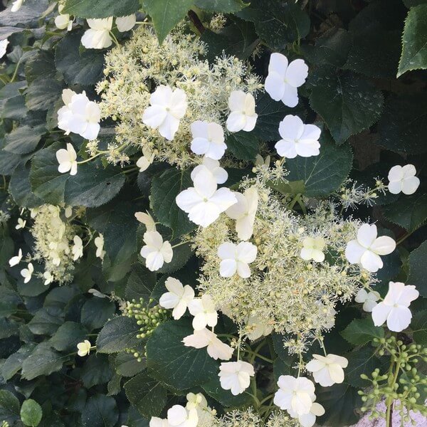 Klätterhortensia ’Petiolaris’ är en mycket attraktiv, sällsynt klätterväxt. Sorten har luftrötter som suger sig fast vid underlaget och därför behöver man inte binda upp växten. Blommorna är små, vita och samlas i klasar. Även de dekorativa, rundade tvåfärgade bladen i grönt och gult på långa skaft är vackra. Lövverket får en fin gyllengul höstfärg och faller av i november. Helt frosttålig. Den kan nå en höjd på upp till 20 m och växer upp till 1 m per år.