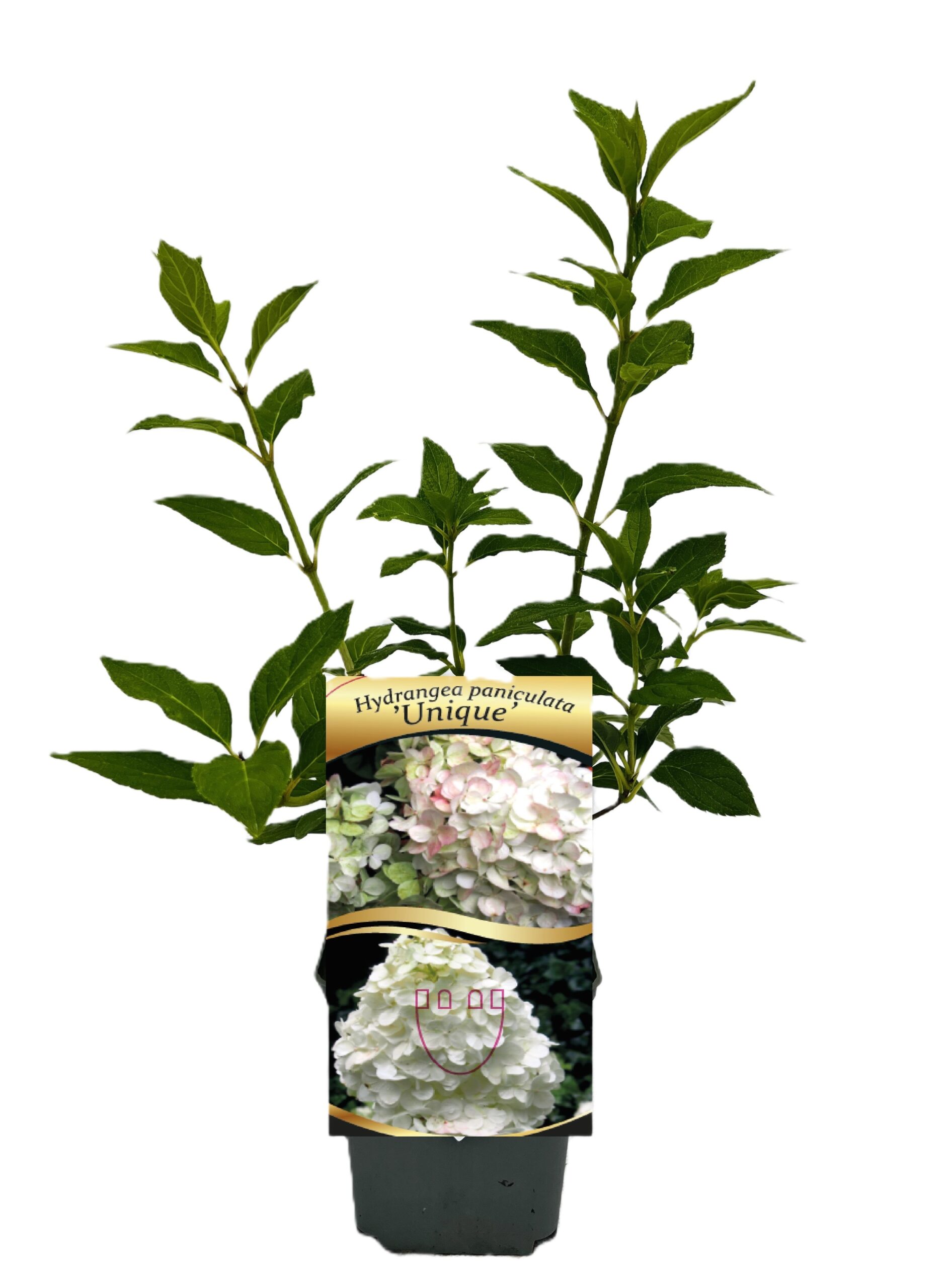 Imponerande buske med styva, upprätta skott, helt frosttålig. Vipphortensia ’Unique’ når en höjd på cirka 2 meter. Rekommenderad för alla trädgårdar på grund av dess låga jord- och lägekrav. Den blommar rikligt på ettåriga skott först i vitt och sedan i rosa.